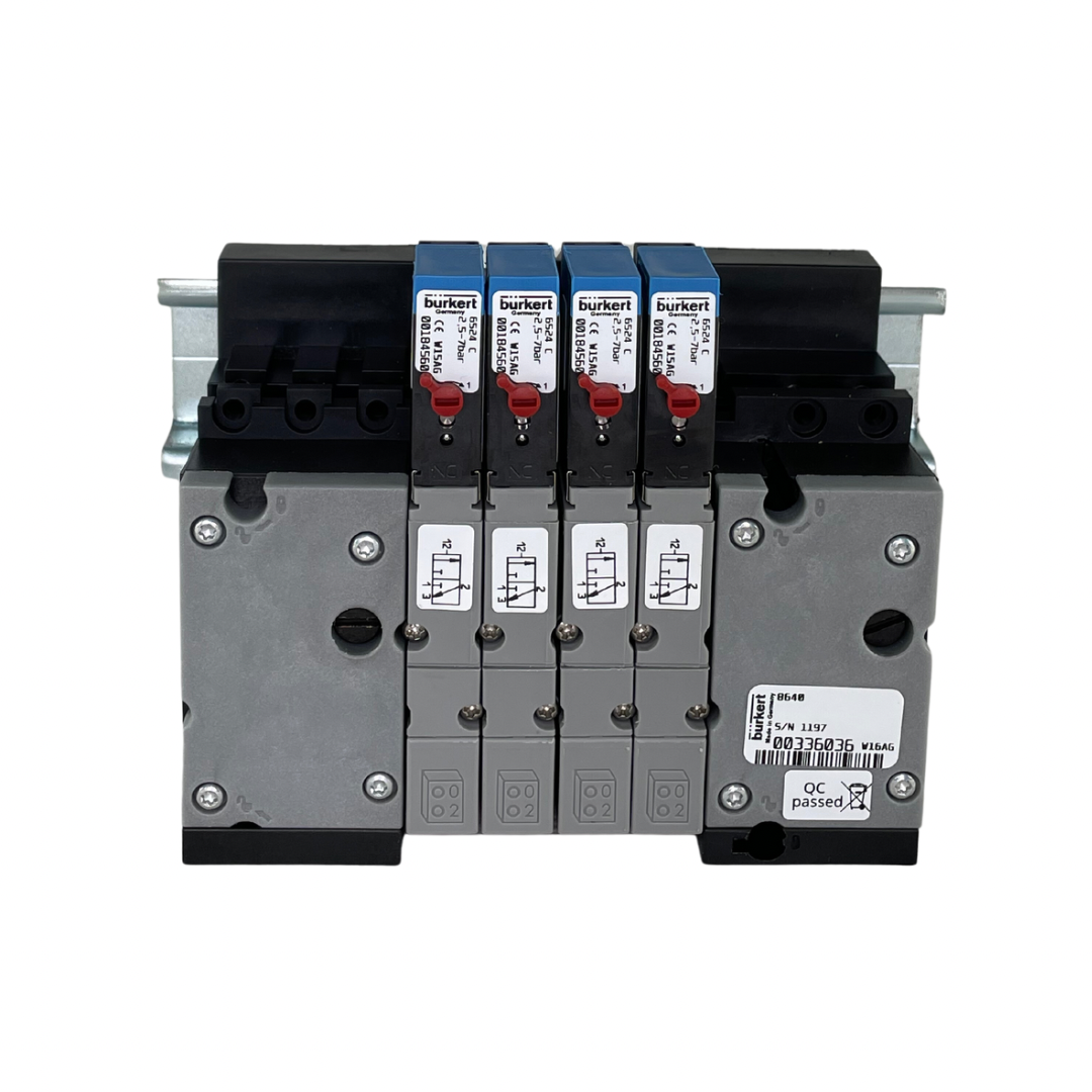 Burkert 8640 Exi Solenoid Valve Block. 4x 6524 3/2 Normally Closed Intrinsically Safe Solenoids. 11mm Width. 6mm Tube Process Connection A/B, G¼” Port connection P/R. ATEX 2G Ex ia IIC T6 . Requires type 2505 wired cable plugs (available to purchase separately in 1m, 3m or 5m length).